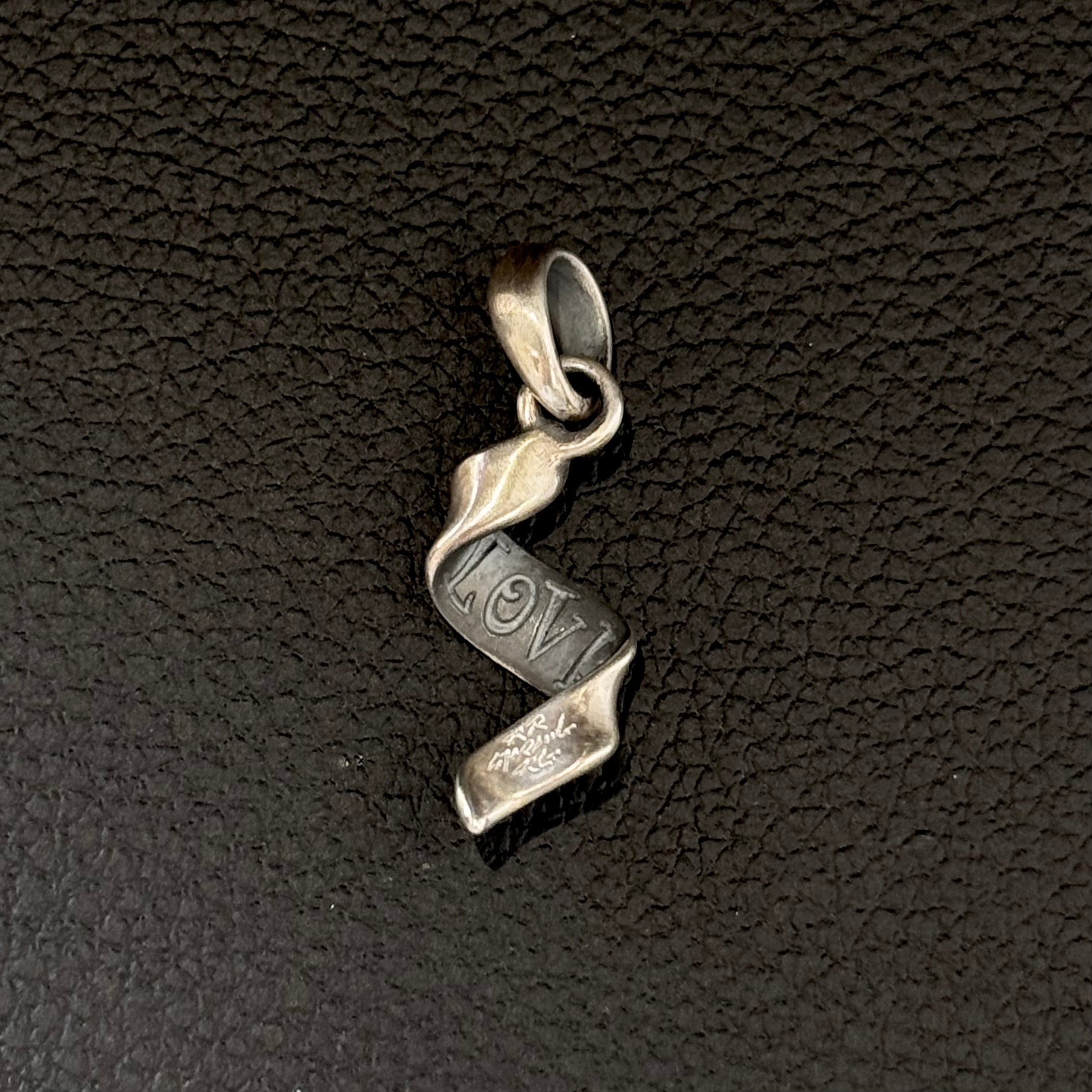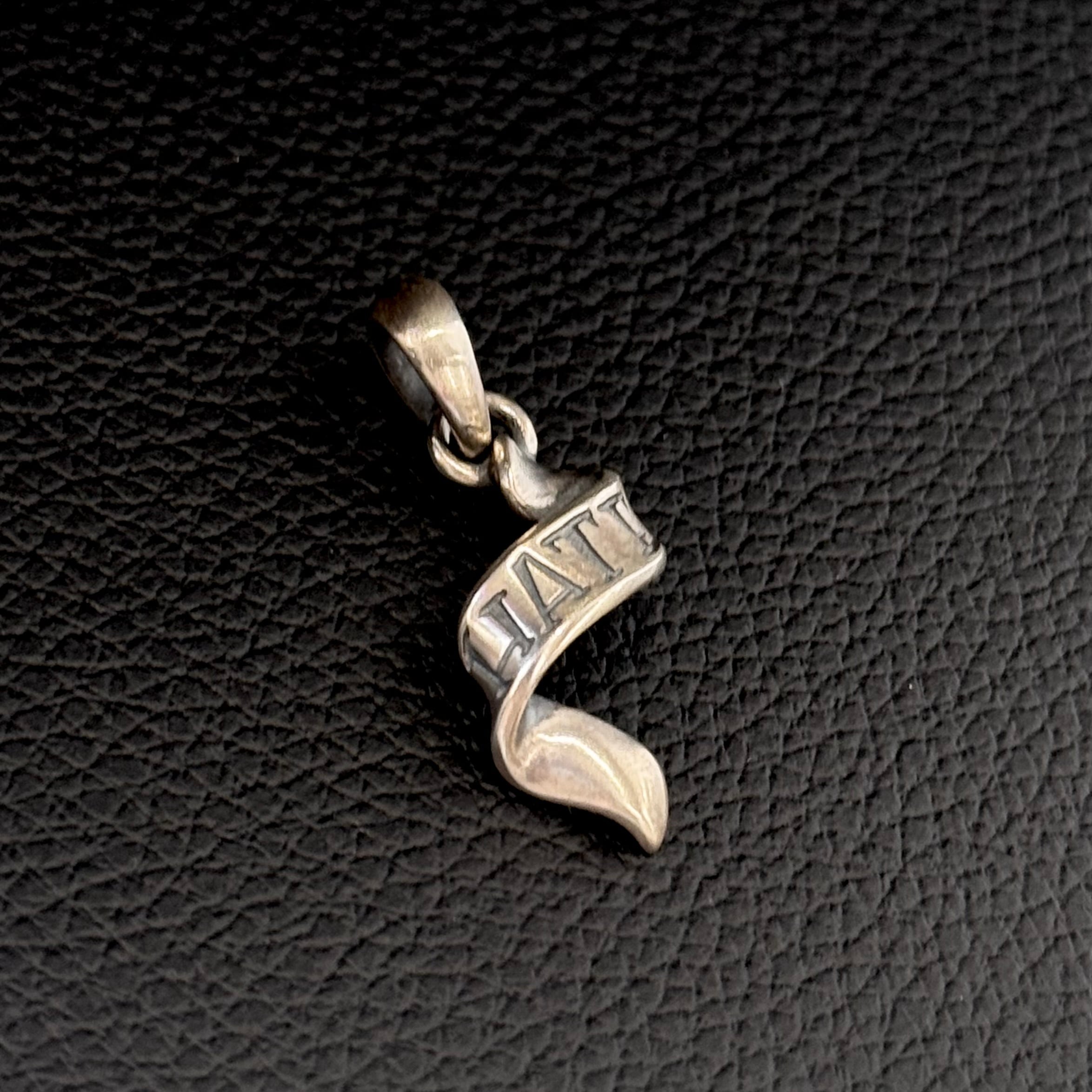 リボンが風にひらめく様を表現されたペンダントトップ。LOVE/HATEの2種類がございます。