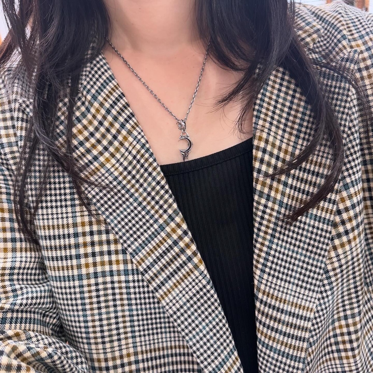 神秘と優雅のブルームーンペンダント。エレガントに描かれた三日月モチーフは、トレサリー風のレイヤードデザインに仕上げられ、漆黒のシンセティックオニキスをセッティング。