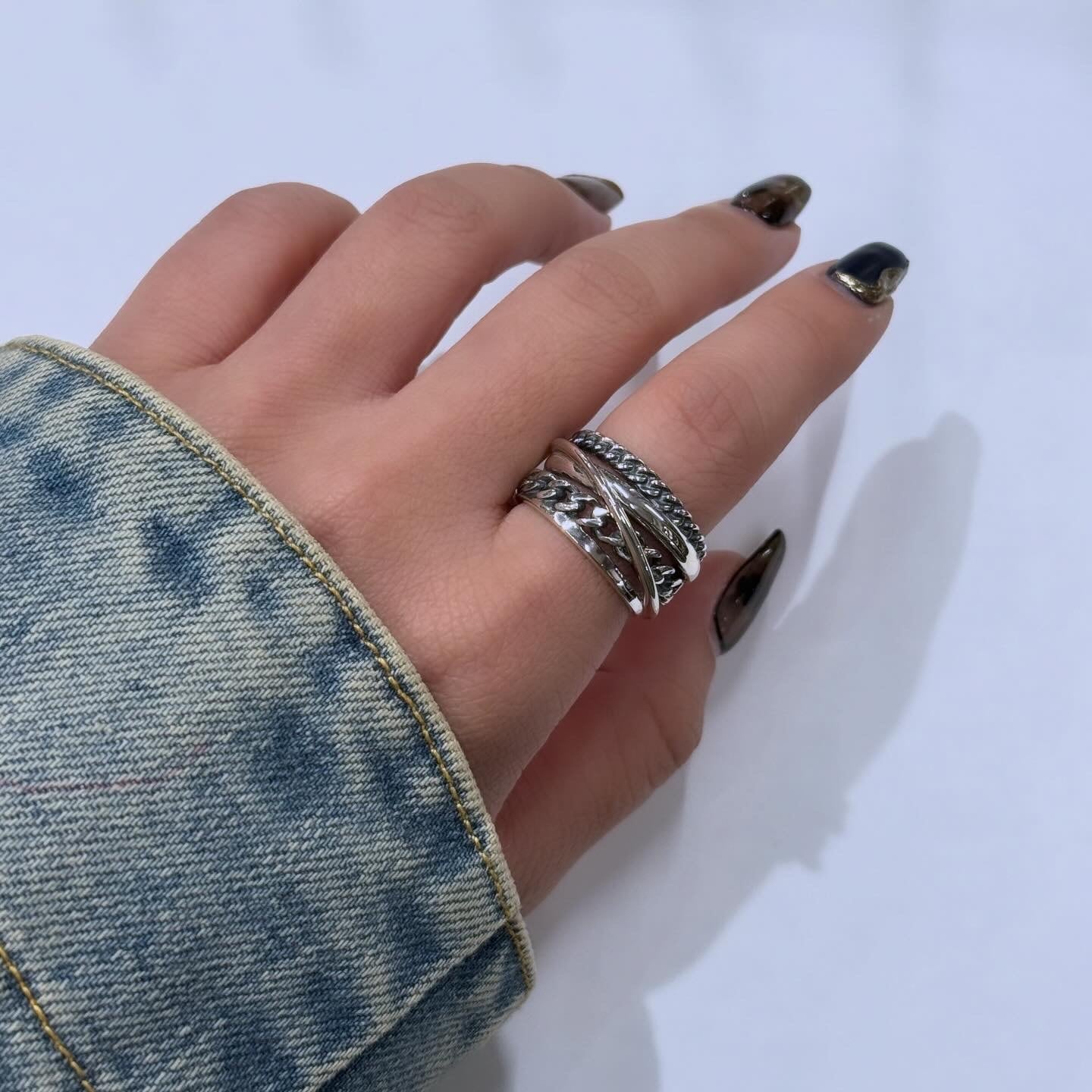 重厚感とモダンな軽やかさを兼ね備えた、存在感あるシルバーリング。喜平チェーンとコウマルリングを幾重にも重ね合わせた構築的なデザインは、力強さと洗練を同時に表現しています。