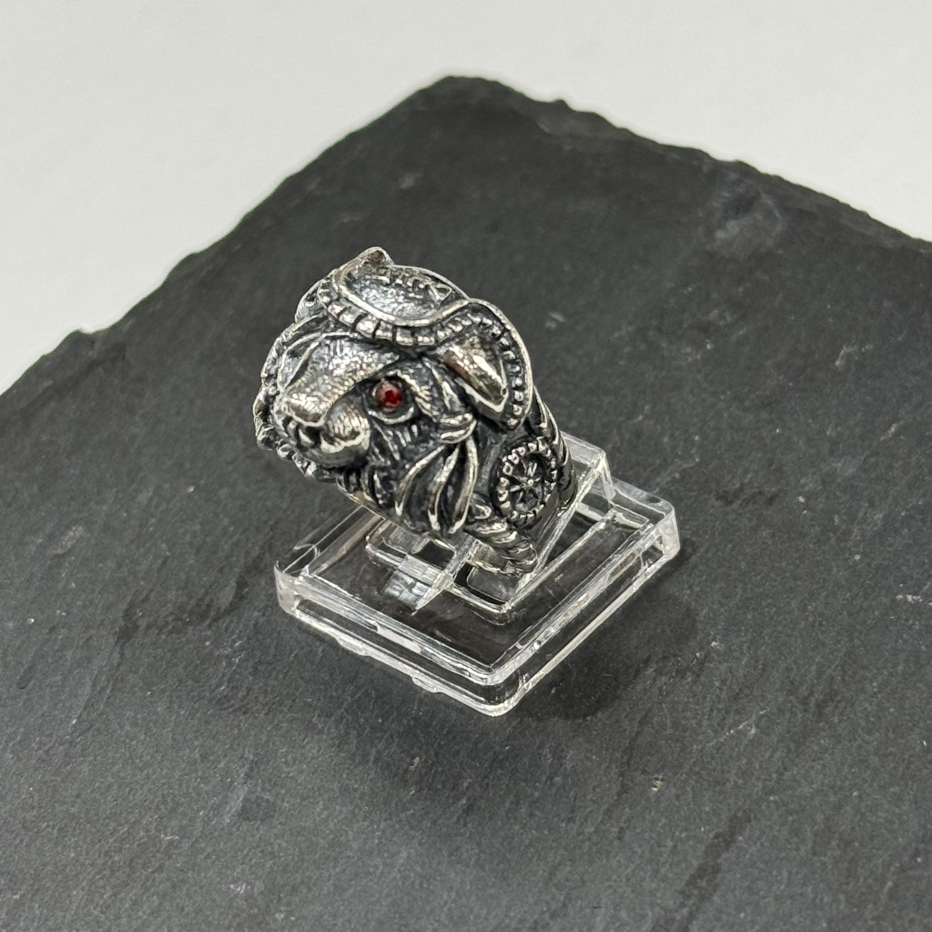 左目にはキュービックジルコニアのレッドカラーをセット。