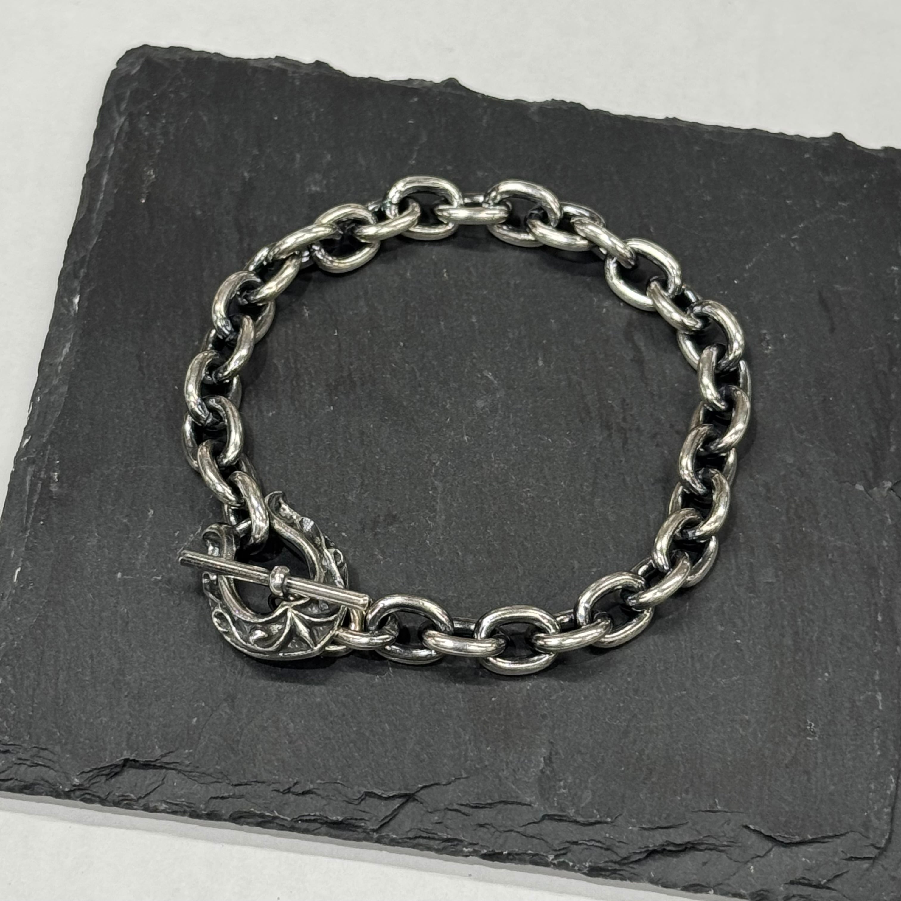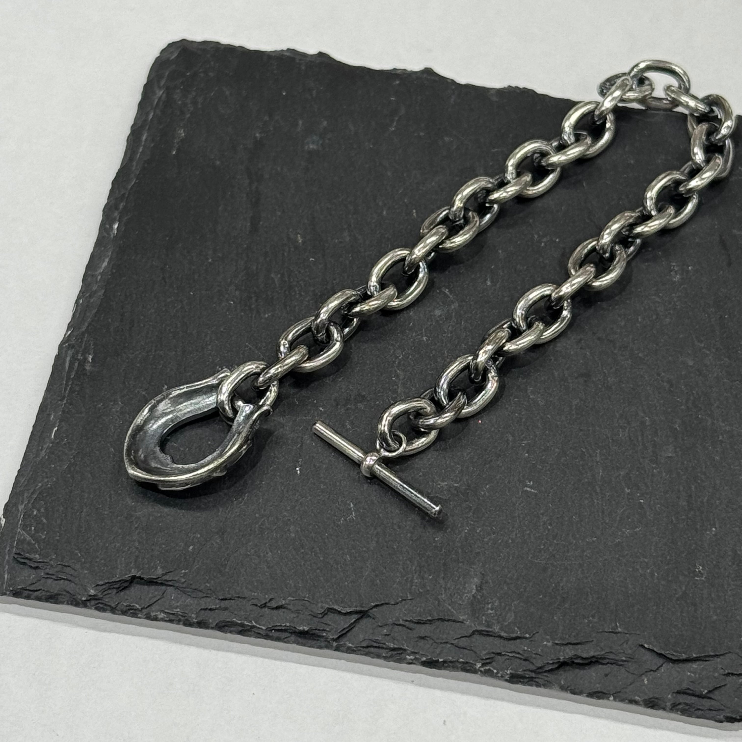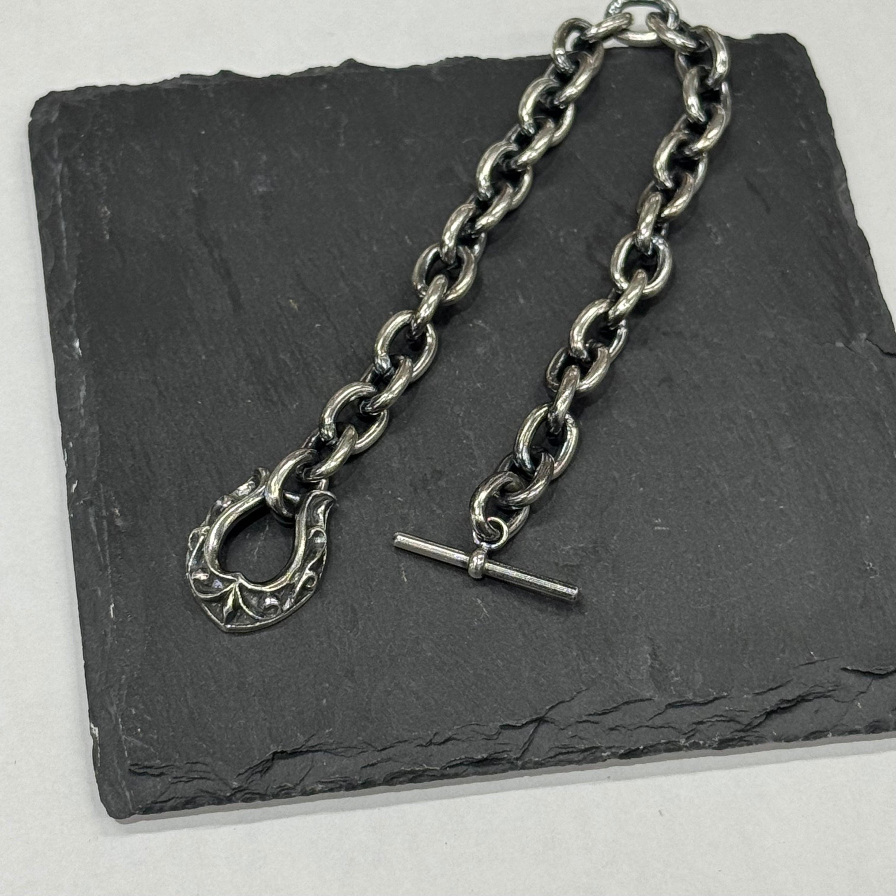 ホースシューの留め具にシンプルかつ使いやすい幅感のあずきチェーンを組み合わせたブレスレット。