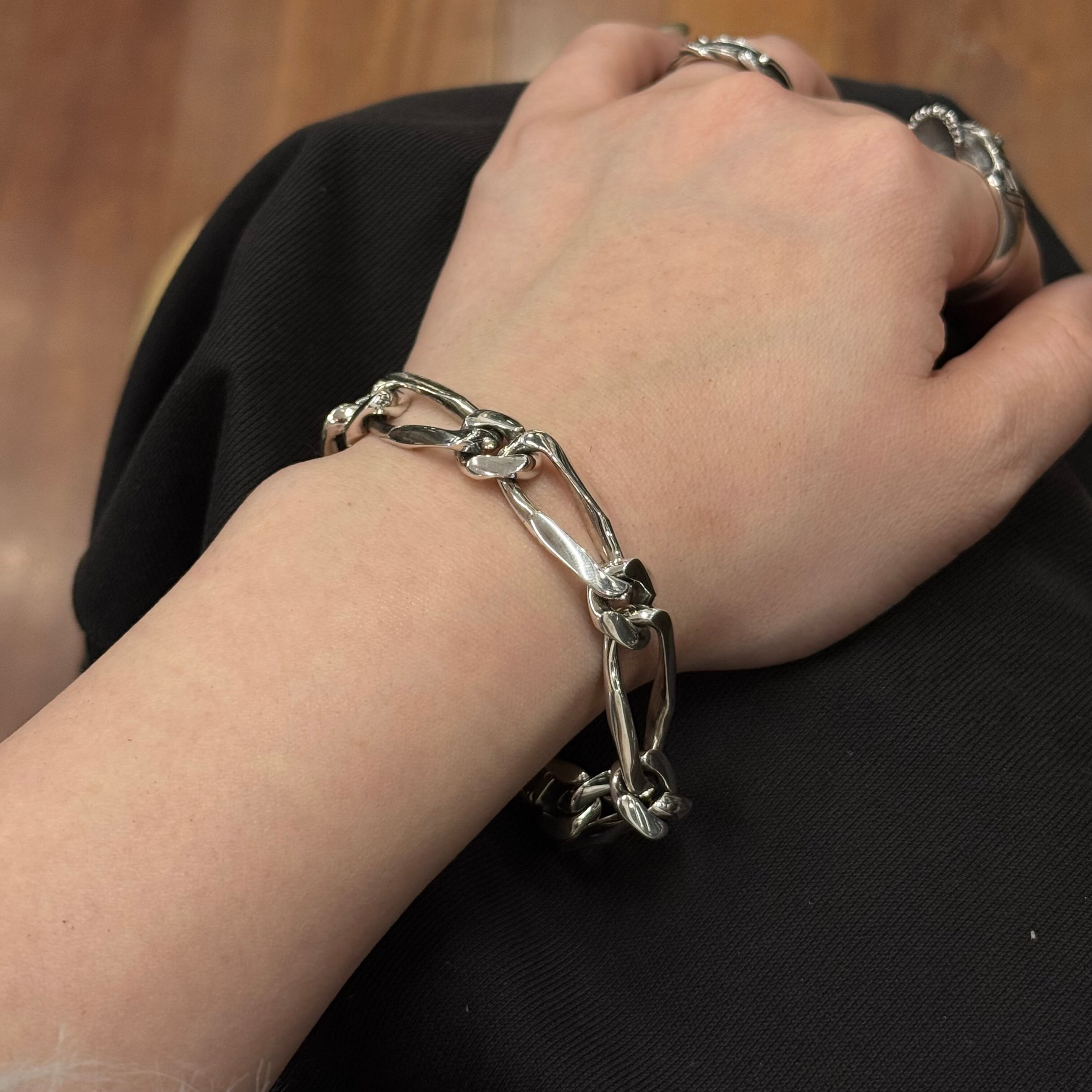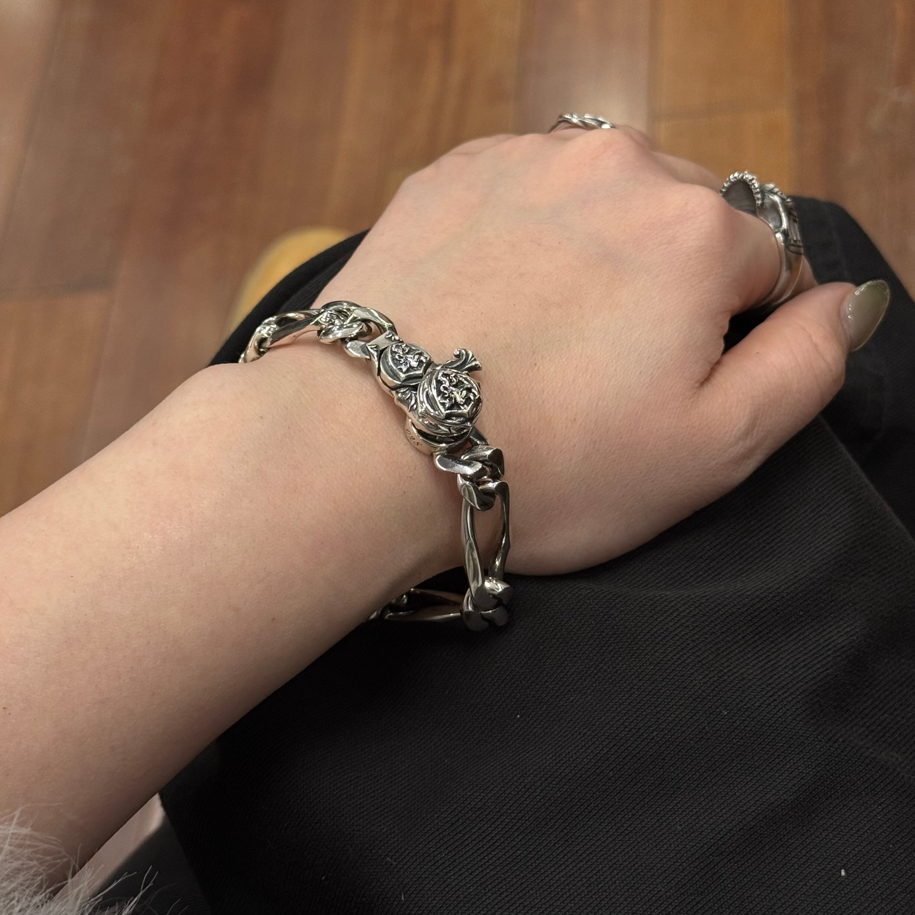 限定100本、各本体にシリアルナンバーを刻む特別仕様。重厚なフィガロチェーンの魅力を研ぎ澄ませた、SV925製ブレスレットです。脱着はナスカン式。留め具にはライオンシールドの紋章を立体的に彫り上げ、手元に静かな威厳を宿します。